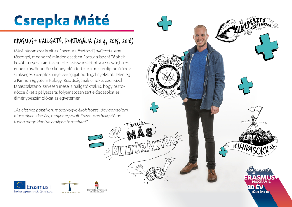 Csrepka Máté fiatal kora ellenére már jelentős nemzetközi tapasztalatot tudhat maga mögött, hisz több alkalommal tanult és dolgozott külföldön – Európában és azon kívül is. Előbb a Fiatalok Lendületben Programmal nemzetközi tréningeken vett részt, majd egy nyarat töltött kint az USA-ban csapatvezetőként, és persze az Erasmus sem maradhatott ki a repertoárból: egy féléves tanulmányi ösztöndíjat és szakmai gyakorlatot is abszolvált. Egy rövid interjú erejéig portugáliai Erasmus-élményeiről beszélgettünk.